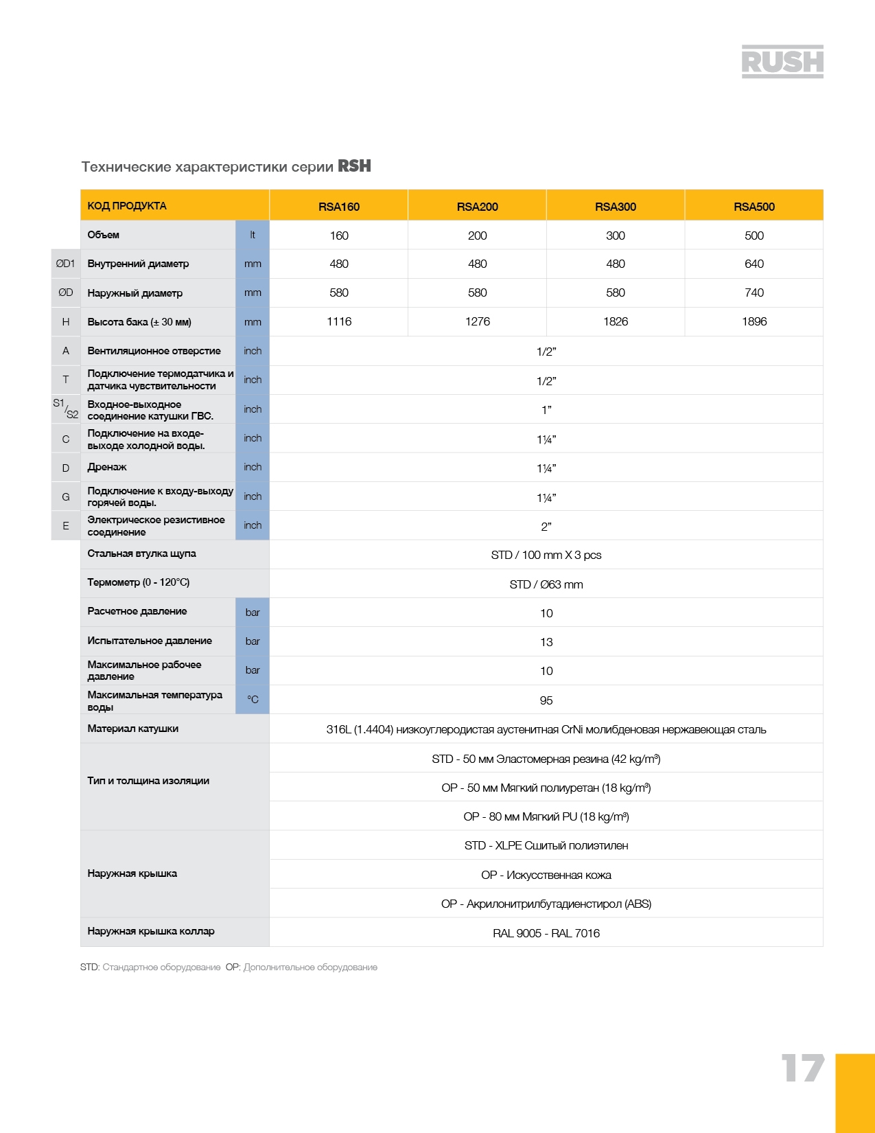 Котлы марки RUSH со змеевиками из нержавеющей стали марки AISI 316L (1.4404) производят гигиеничную воду, а также служат буферным баком для тепловых насосов. К котлам с тепловым насосом может быть подключен другой источник тепла для поддержания теплового насоса системы. Устройства модели RSH рекомендуются для инверторных и вкл/ выкл тепловых насосов.